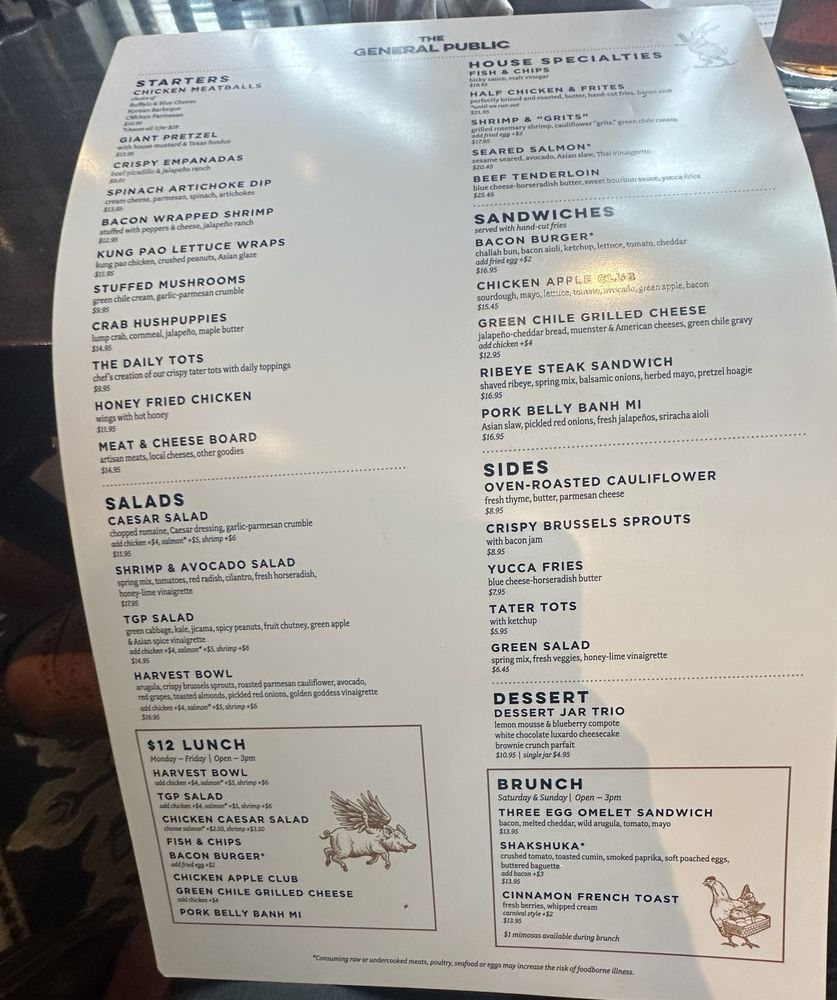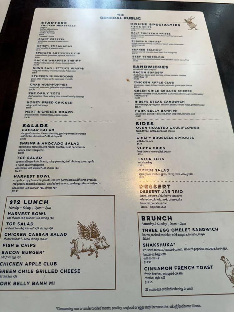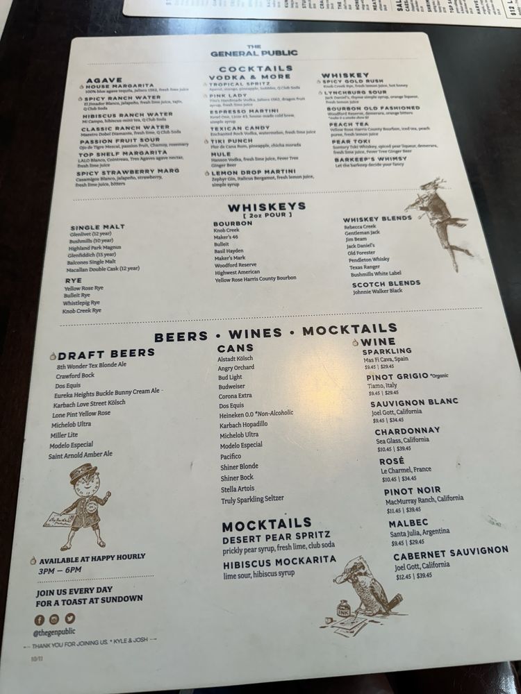 The General Public is a trendy New American restaurant and bar located in Houston, TX. They offer a variety of dishes for breakfast, brunch, and dinner, with limited vegetarian options available. The restaurant is wheelchair accessible and accepts various forms of payment, including cryptocurrency. With outdoor seating, garage parking, and free Wi-Fi, it provides a comfortable and convenient dining experience. The General Public is known for its happy hour specials, full bar, and entertainment options like TV and pool tables. Whether you're looking for a place to hang out with friends, have a family meal, or enjoy a night out, The General Public offers a diverse and exciting menu in a vibrant atmosphere.